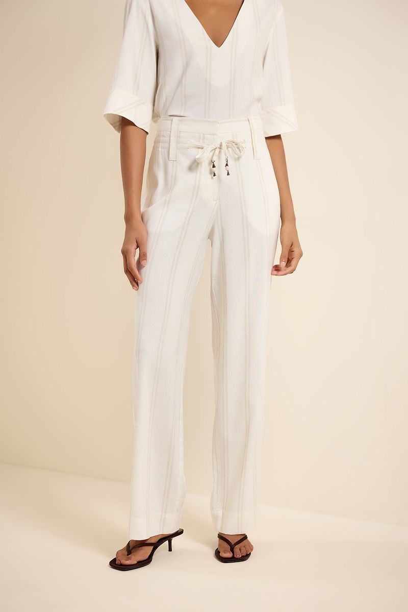 Composição | Calça de tecido plano em viscose com linho, jogo de listras, modelagem pantalona, bolso lateral e posterior, passadores largos, cós com amarração por rolotê e fechamento por zíper e colchete. Modelo veste tamanho 38. |