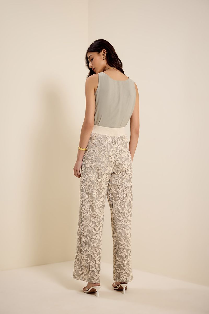 Calça de tecido plano telado com bordado, modelagem pantalona e elástico e tricot canelado no cós. peça possui forro. modelo veste tamanho 38.