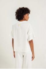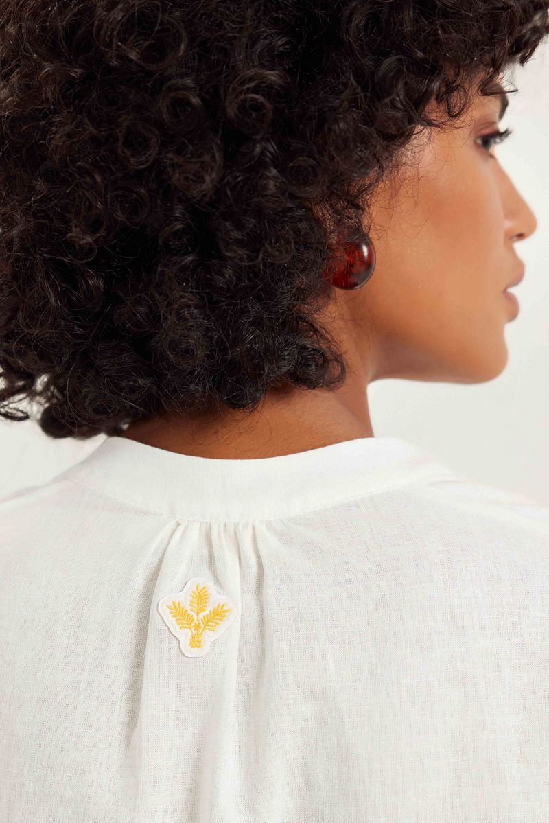 Camisa de tecido plano em cambraia de linho com viscose, modelagem solta ao corpo, manga curta, decote v com gola e pate, pala frontal e patch costas inspirado na estampa "férias" da coleção. modelo veste tamanho 38.