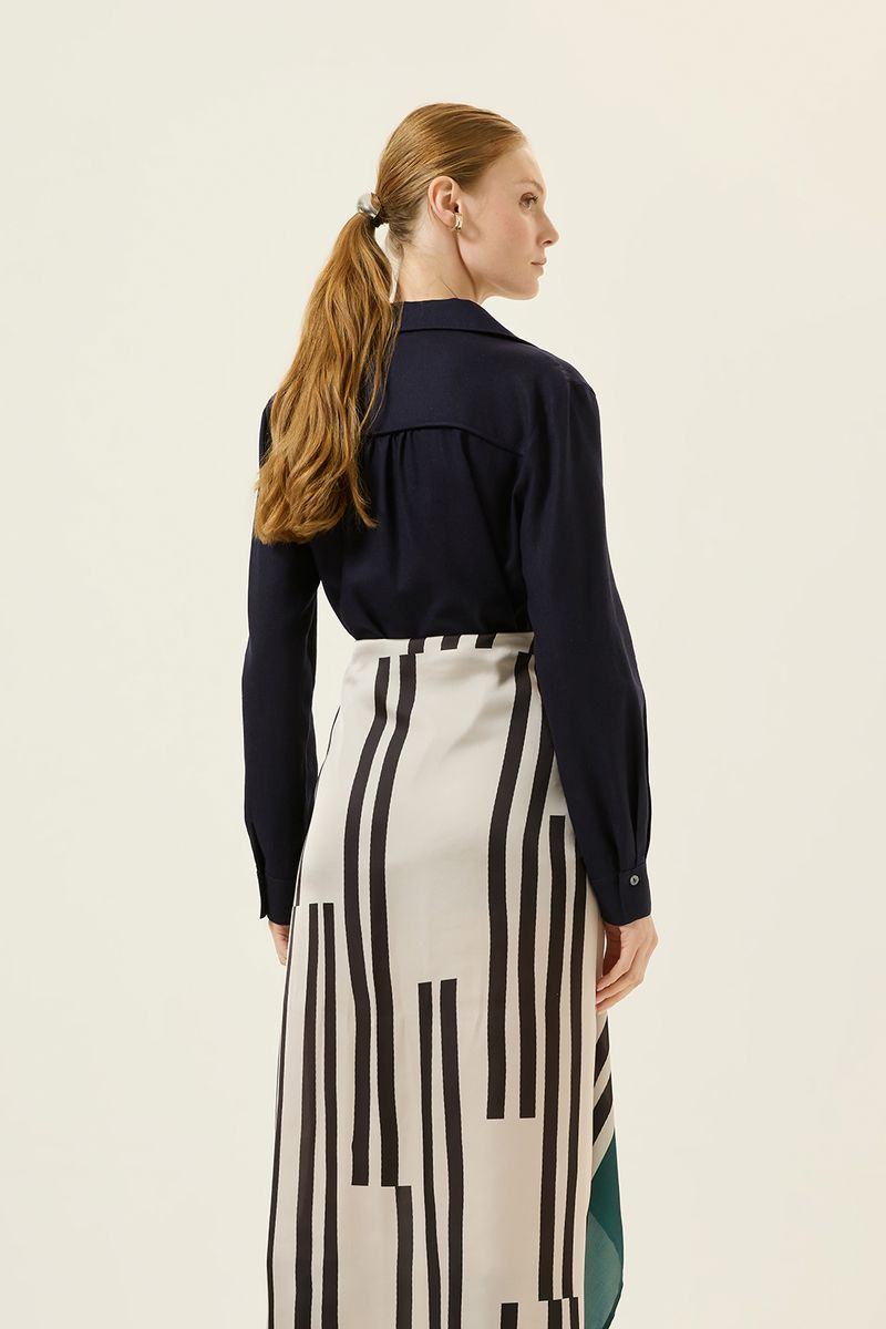 Camisa de tecido plano em viscose com linho, modelagem reta com gola, manga longa com abotoamento no punho, fenda na lateral com comprimento posterior levemente mais alongado, detalhe vivo e fechamento frontal por botões. modelo veste tamanho 38.