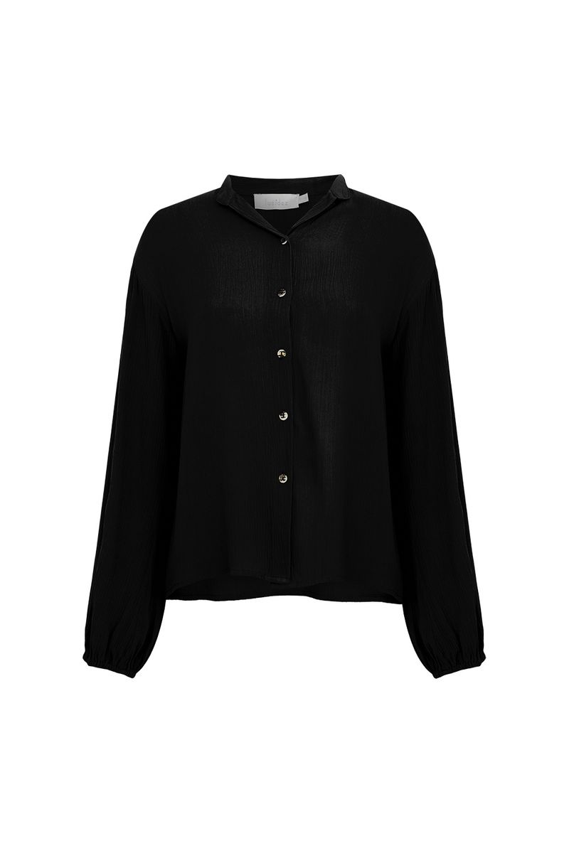 Camisa de tecido plano em viscose, modelagem solta ao corpo, com manga ampla e elástico no punho e fechamento frontal por botões. modelo veste tamanho 38.