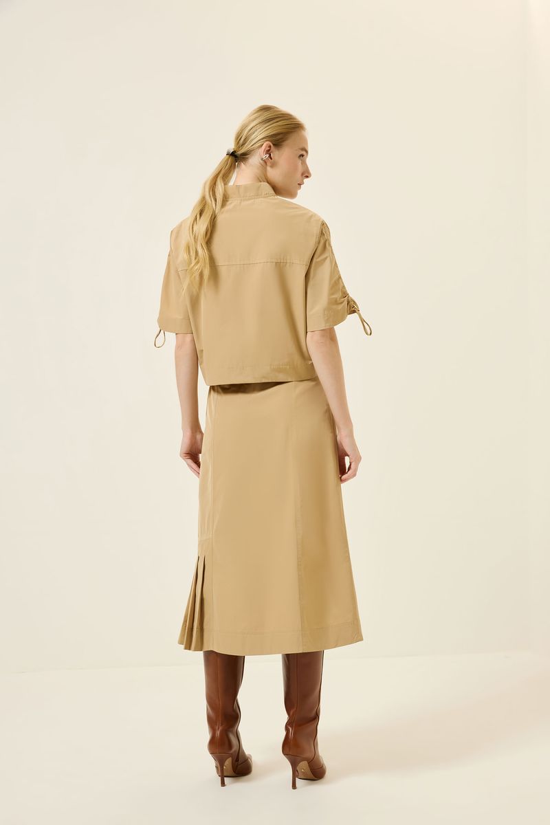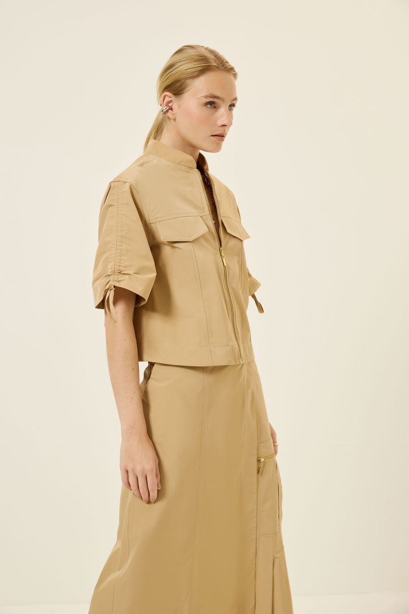 Camisa de tecido plano em tecido tecnológico, modelagem reta e comprimento cropped, manga curta com regulagem por stoppes, lapela frontal, recortes e fechamento frente por zíper de metal destacável. modelo veste tamanho 38.