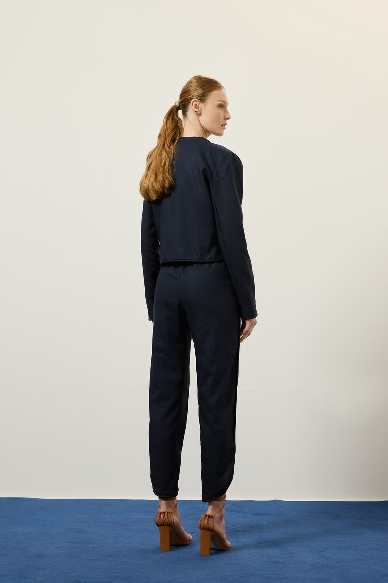 Casaco de tecido plano em rami e algodão, modelagem reta, manga longa com detalhe em vivo no punho, decote e barra, bordado arabesco frontal e barra arredondada. modelo veste tamanho 38.