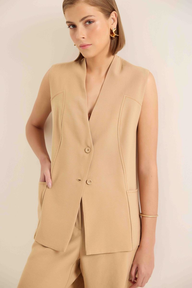 Colete de tecido plano em viscose, modelagem reta com recortes, bolso lateral, sem manga e fechamento frontal por botão forrado. peça possui forro e pesponto contrastante. modelo veste tamanho 38.