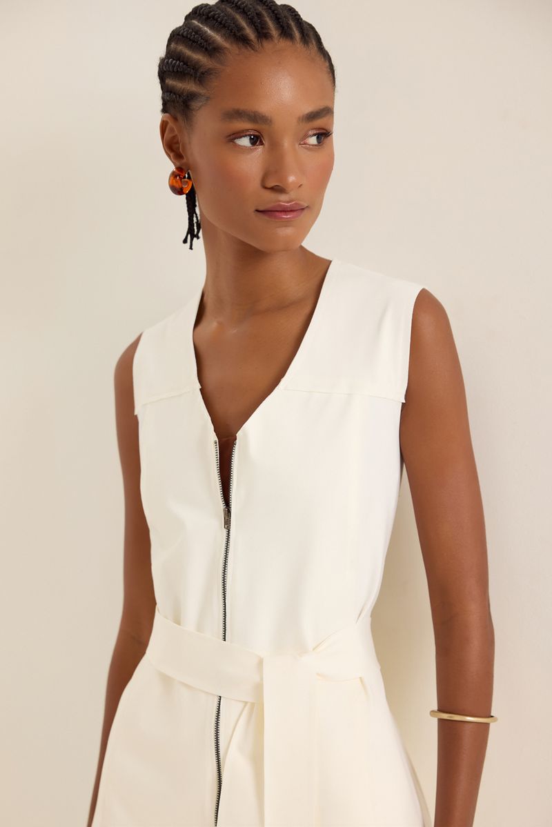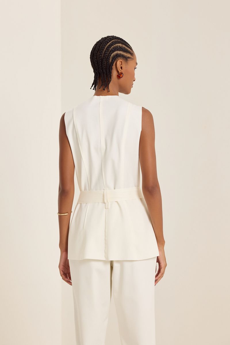 Colete em malha premium tecnologica estruturada de poliamida com elastano, modelagem reta, sem manga, decote v, fechamento em zíper de metal frontal com puxador especial e faixa solta para amarração. modelo veste tamanho p.