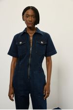 Macacão jeans em algodão, modelo cenoura com manga curta e gola, bolso quadrado frontal e bolso posterior, elástico na cintura e barra para melhor ajuste e fechamento frente po zíper de metal. peça possui bolso frontal com detalhe de metal na tampa. modelo veste tamanho 38.