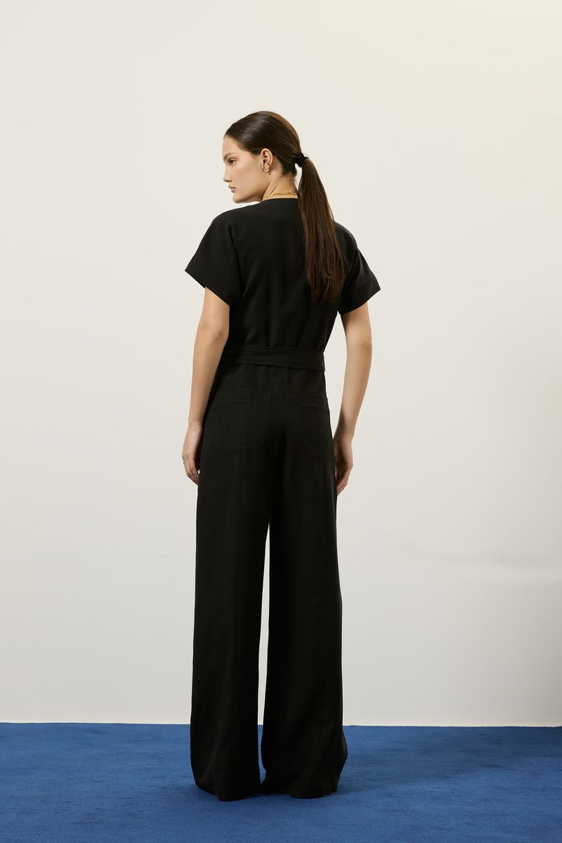 Macacão de tecido plano em lyocel, modelo pantalona, pala frente aplicada com rebites, decote redondo, manga curta, bolso lateral e fechamento frontal por zíper de metal. peça possui forro e faixa do próprio tecido. modelo veste tamanho 38.