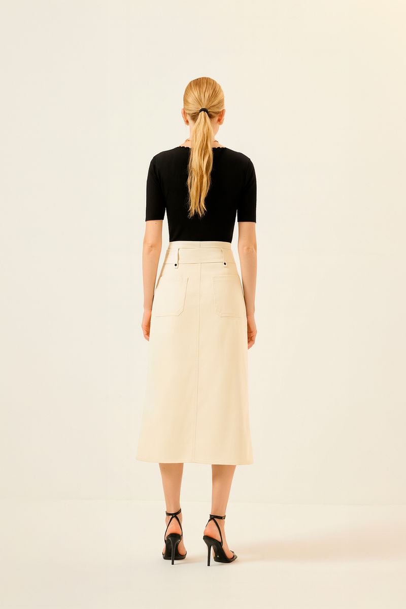 Saia de tecido plano em alfaiataria com elastano, modelagem reta sem cós com passadores e detalhe de rebite, bolso lateral e posterior, fenda frontal e fechamento por zíper e colchete. peça acompanha faixa do próprio tecido com fivela de metal. modelo veste tamanho 38.