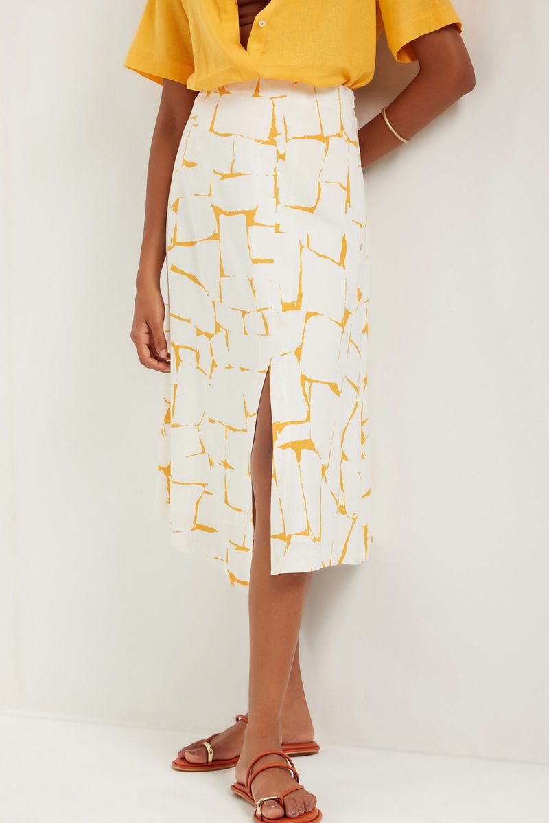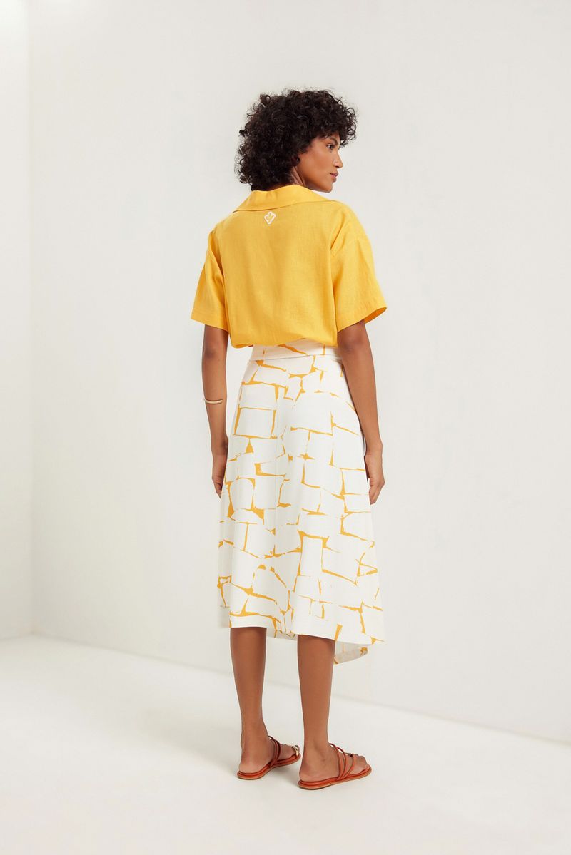 Saia de tecido plano viscose alfaiataria maquinetada com linho estampa azulejo, modelagem evasê, recorte com fenda frontal, barra assimétrica, peça forrada e fechamento em zíper lateral. modelo veste tamanho 38.