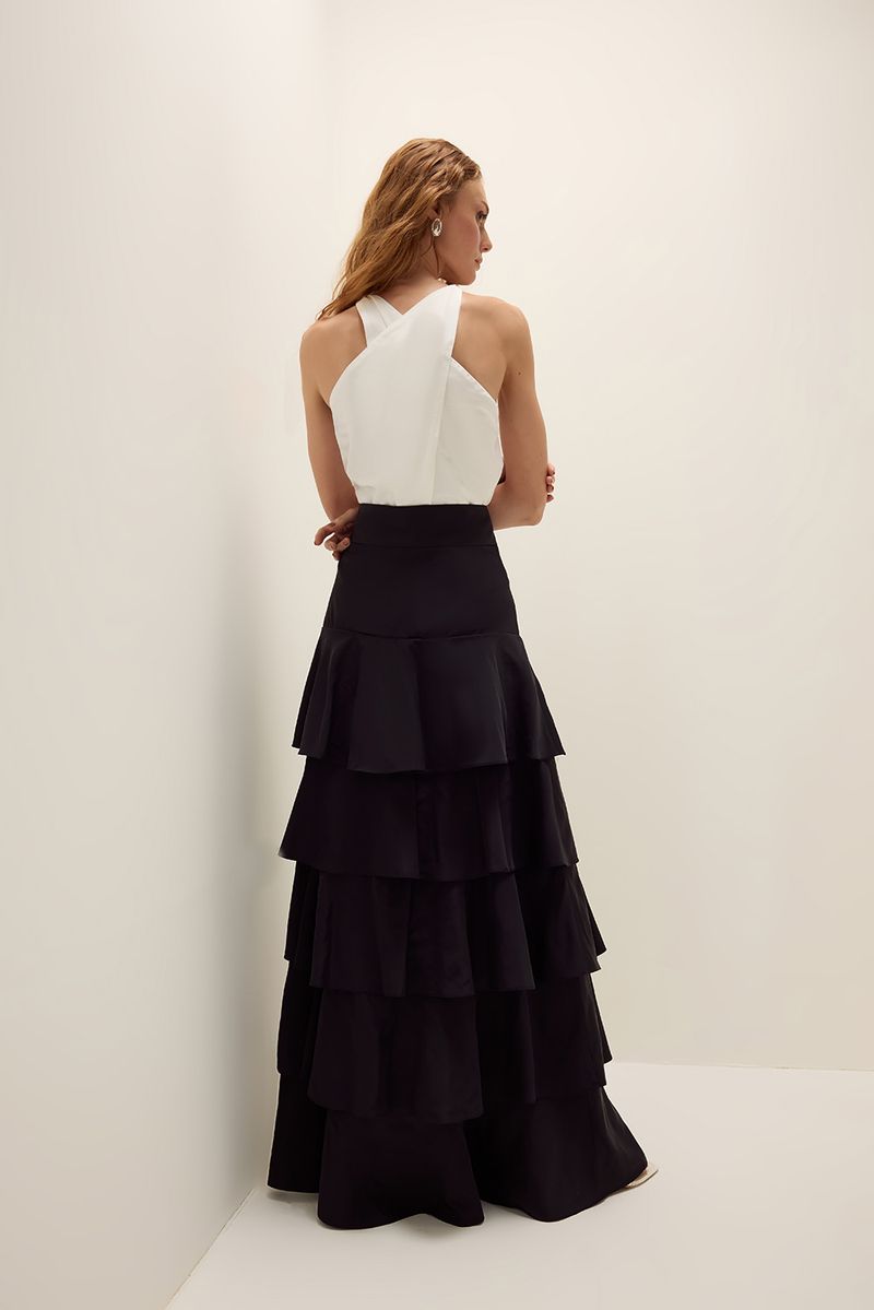 Saia detafetá levemente encorpado com elegante brilho, com camadas em babados, comprimento longo e fechamento em zíper lateral. modelo veste tamanho 38. peça pensada para usar com body festa transpasse sofia.