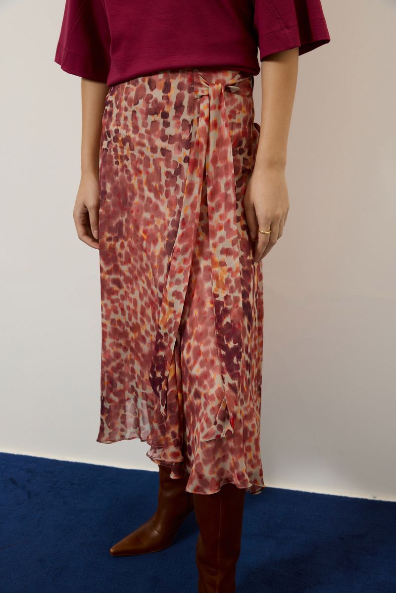 Saia de tecido plano em ggt de viscose leve e fluido estampa flash, modelagem evasê, detalhe recorte frontal com amarração lateral, comprimento midi e fechamento em zíper lateral. peça forrada. modelo veste tamanho 38.