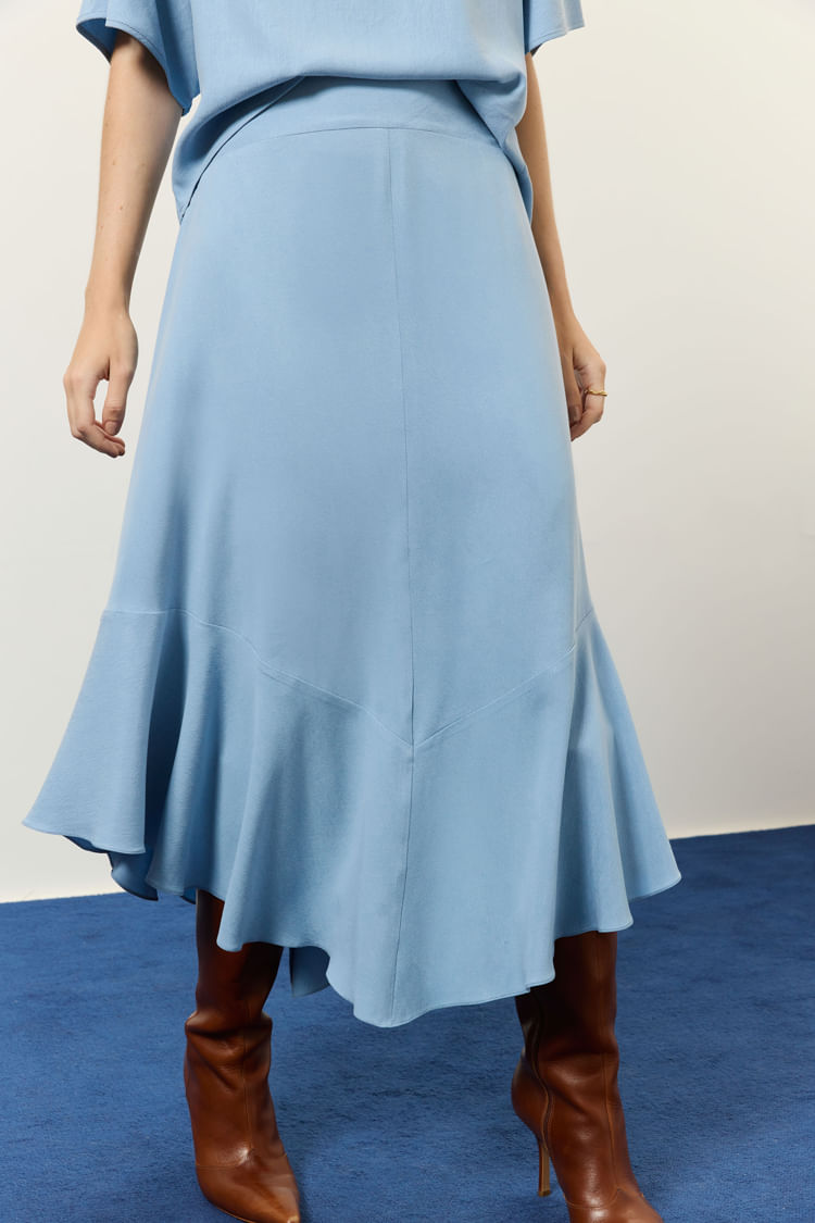 Saia de tecido plano em liocel com viscose, comprimento midi com recortes, barra irregular e fechamento lateral por zíper invisível. peça possui forro. modelo veste tamanho 38.