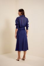 Saia de tecido plano em rami, comprimento midi, leve fenda posterior e fechamento lateral por zíper invisível. peça possui forro. modelo veste tamanho 38.