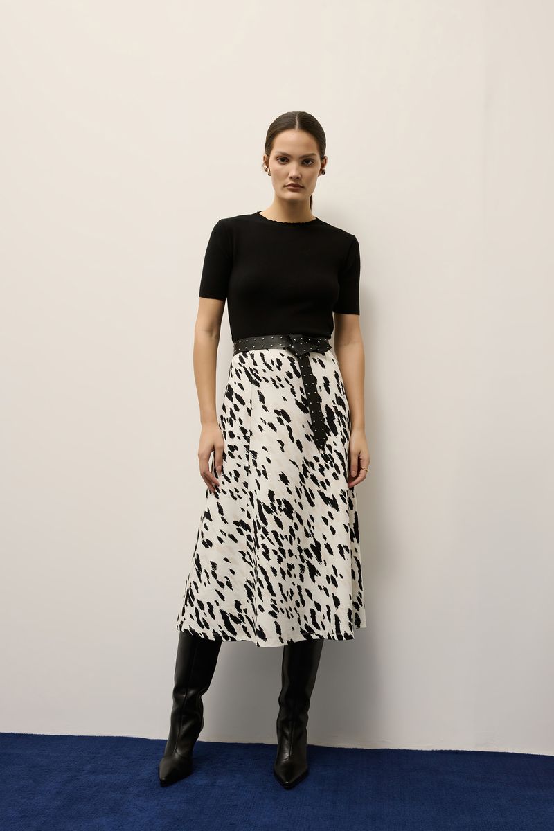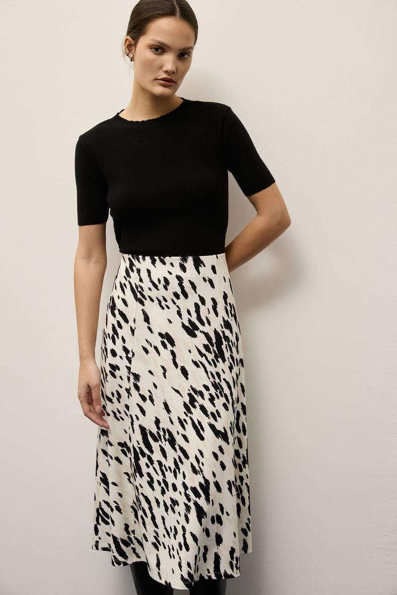 Saia malha de viscose sustentável proveniente de fontes renováveis, estampa montaria, modelagem evasê, cós elástico, recorte frontal e posterior e comprimento midi. modelo veste tamanho p.