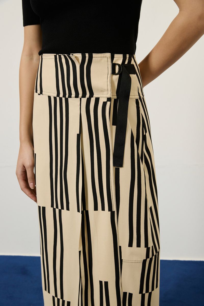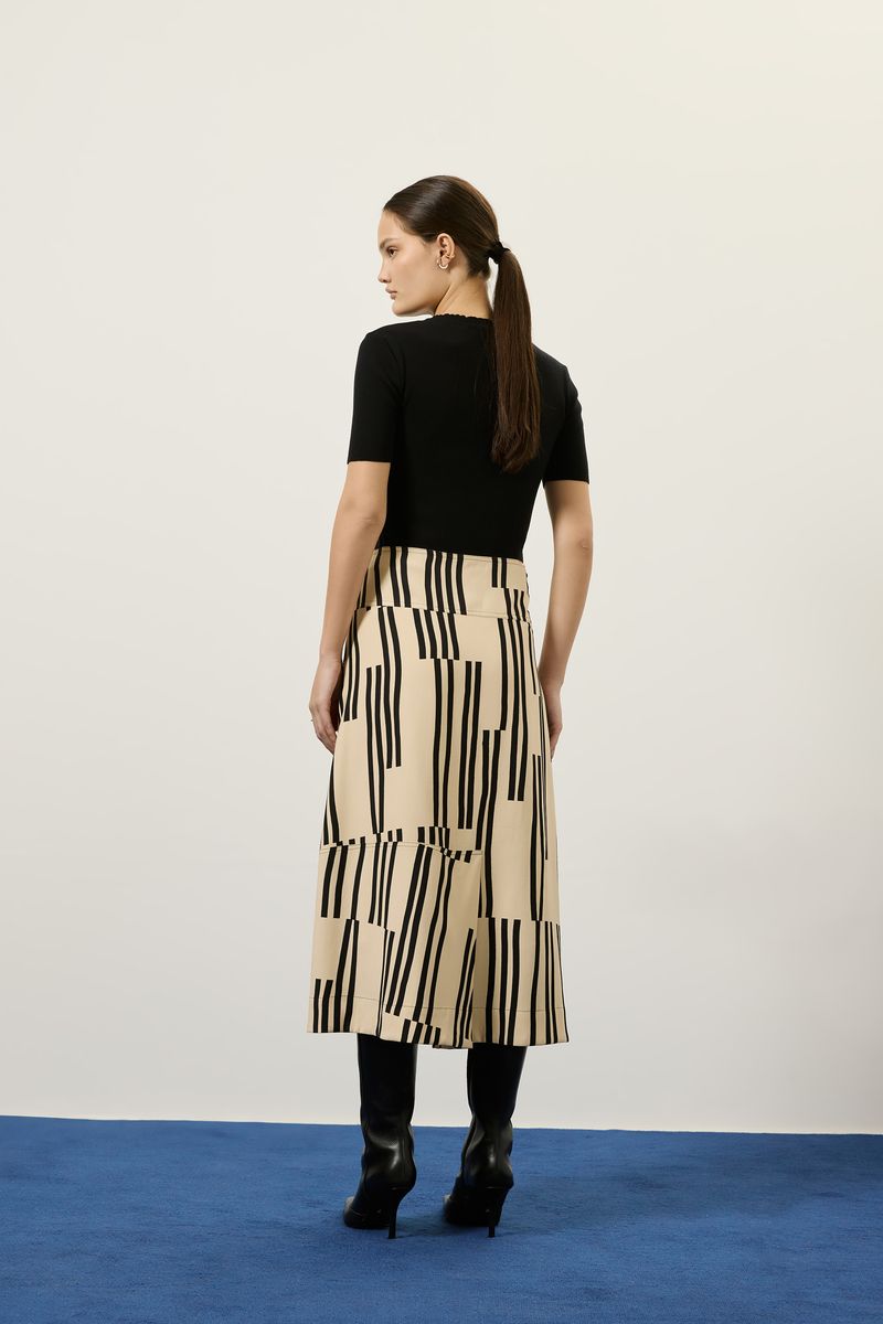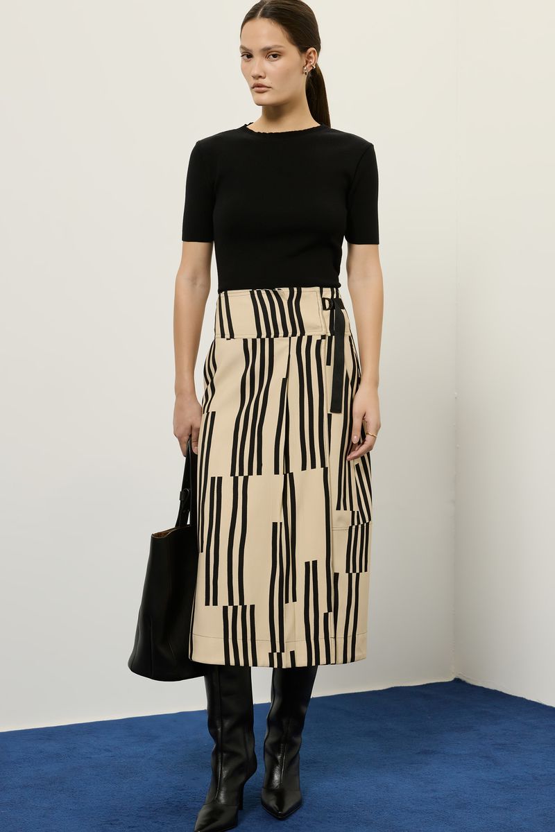 Saia de tecido plano em viscose estampa partituras, modelagem transpassada, cós largo com detalhe passador e faixa fixa amarração, bolso faca e comprimento midi. modelo veste tamanho 38.