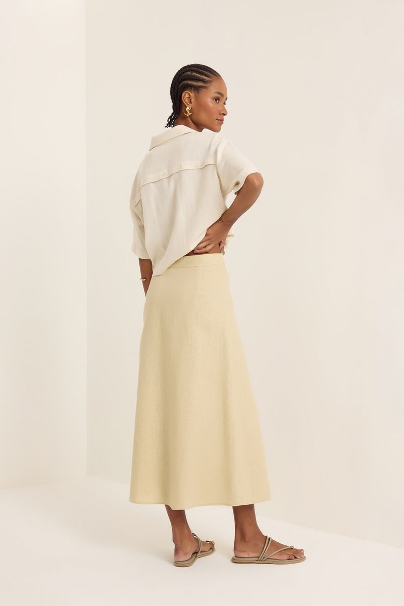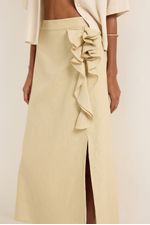 Saia de tecido plano em rami e algodão, comprimento midi, fenda frontal, babado em formato de flor do próprio tecido e fechamento lateral por zíper invisível. peça possui forro. modelo veste tamanho 38.