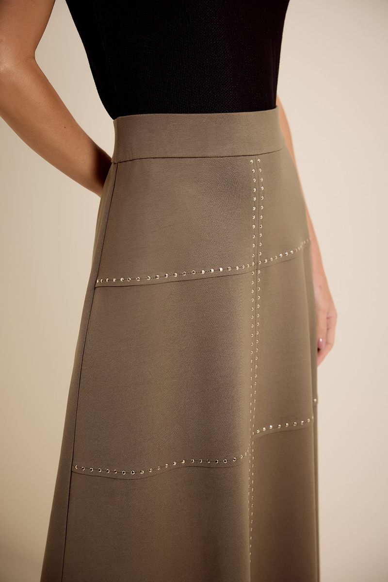 Saia malha viscose sustentável proveniente de fontes renováveis, modelagem evasê, cós elástico forrado e detalhes aplicações com tachas. modelo veste tamanho p.