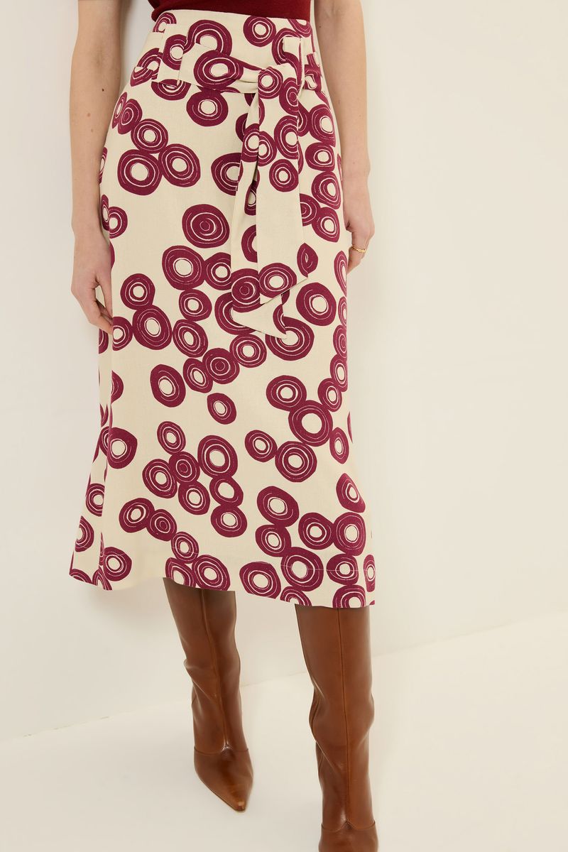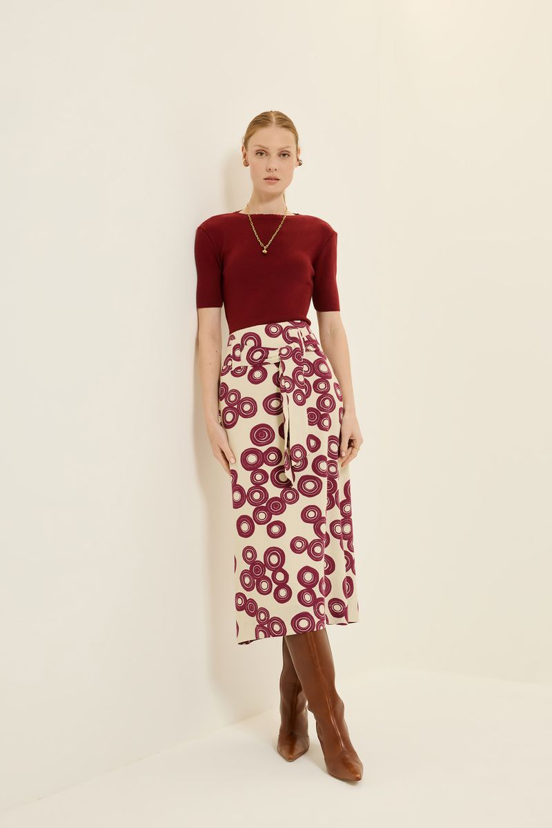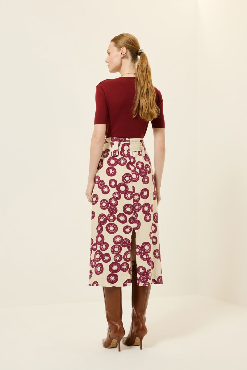 Saia de tecido plano em linho com viscose estampa disco, modelo reto, passador com faixa para amarração, fenda posterior, comprimento midi e fechamento em zíper lateral. modelo veste tamanho 38.