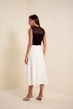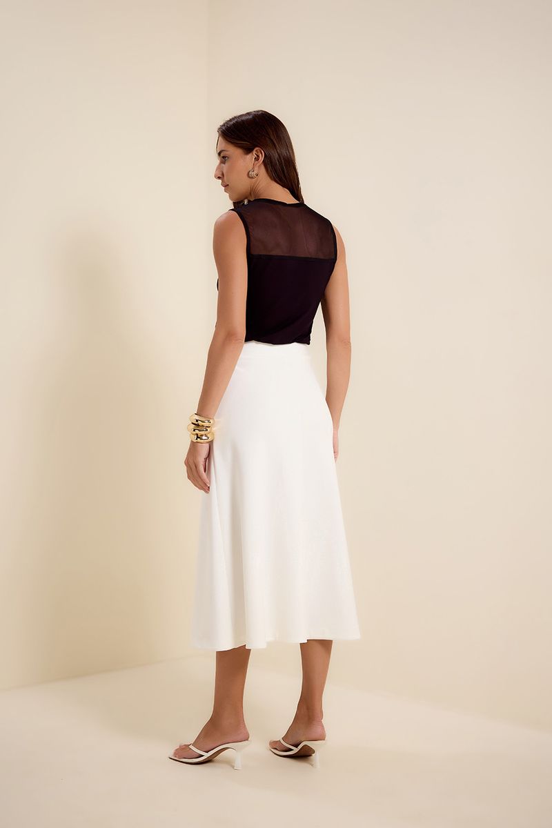 Saia malha de viscose sustentável proveniente de fontes renováveis, modelagem evasêm cós com elástico forrado, detalhe silk floral frontal e comprimento midi. modelo veste tamanho p.