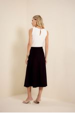 Saia malha de viscose sustentável proveniente de fontes renováveis, modelagem evasêm cós com elástico forrado, detalhe silk floral frontal e comprimento midi. modelo veste tamanho p.