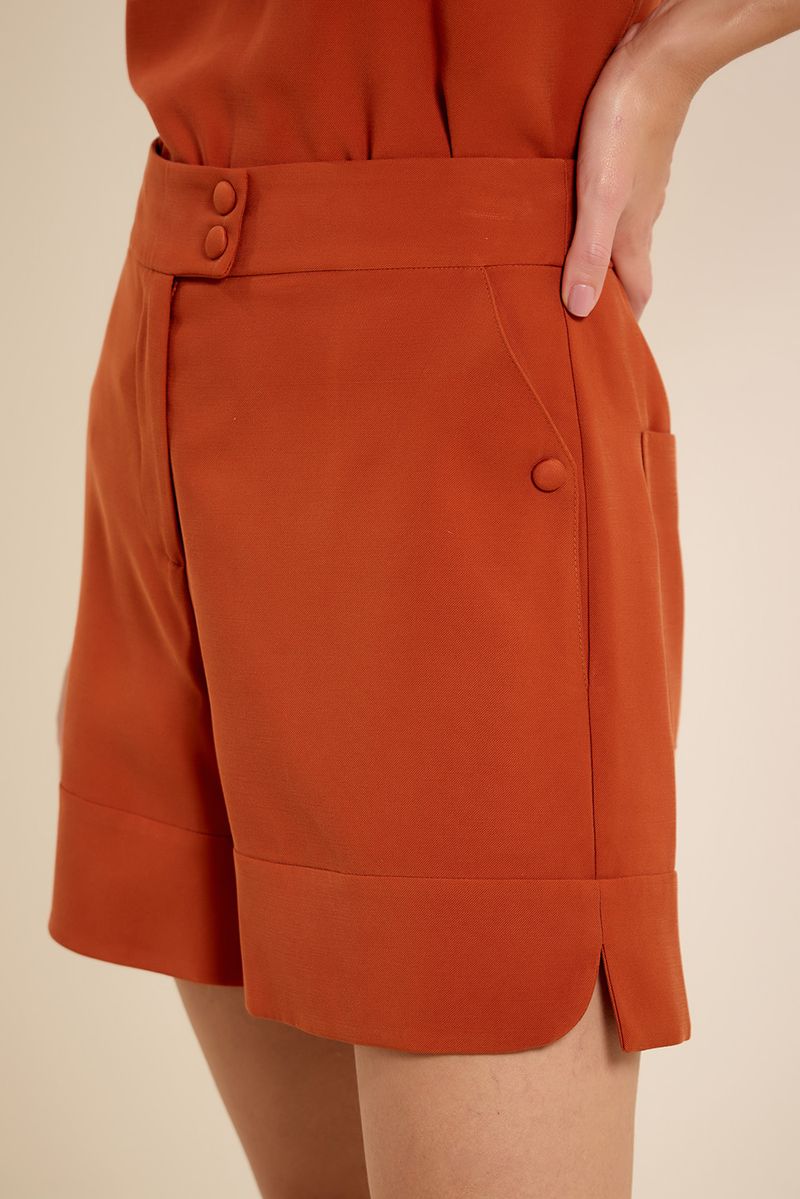 Short de tecido plano em viscose mista com barra arredondada e leve fenda lateral, bolso faca com botão forrado, bolso posterior e fechamento frontal por zíper e botão. peça não acompanha lenço. modelo veste tamanho 38.