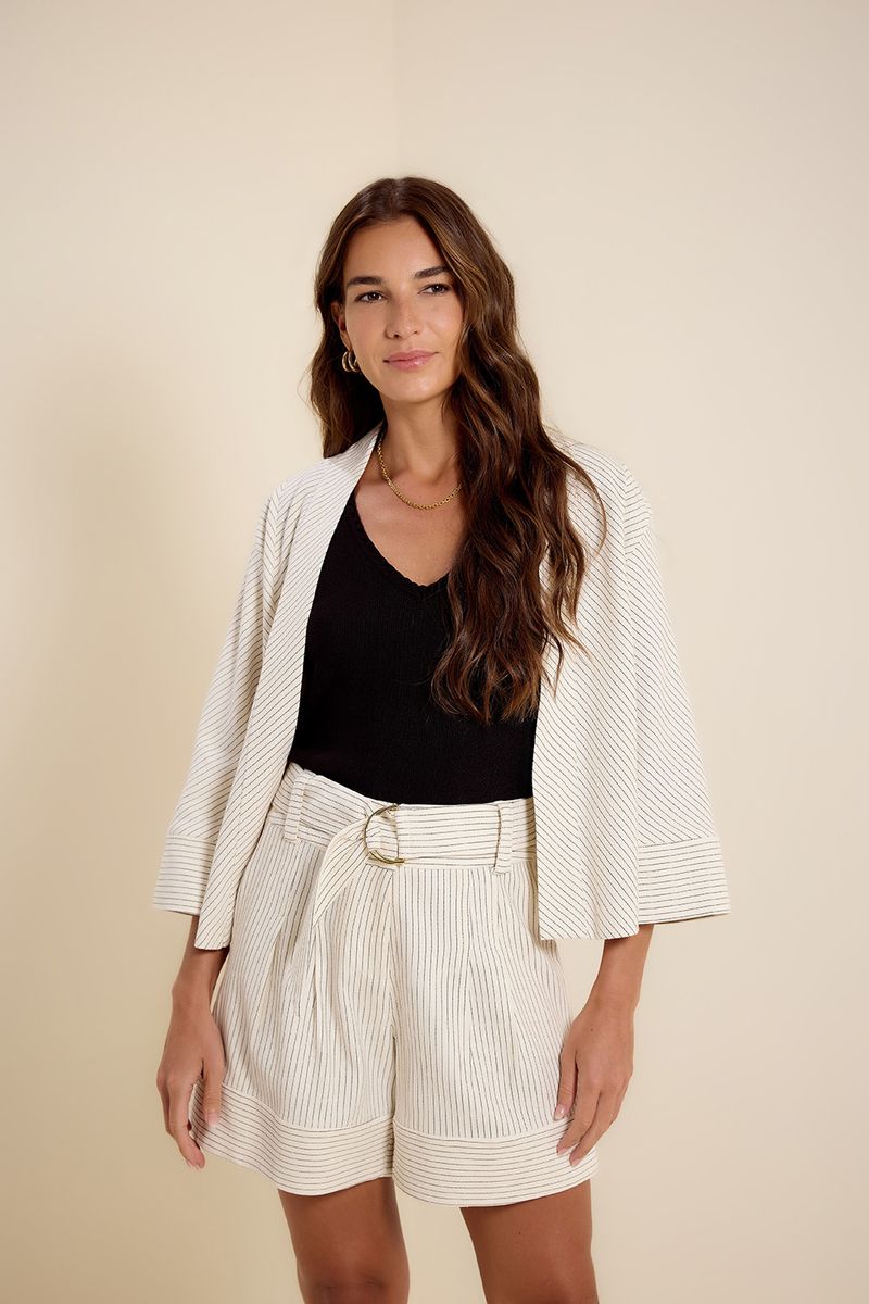 Short de tecido plano em algodão e viscose com mix de listras, bolso lateral, passadores, leve prega frontal e fechamento frente por zíper e colchete. peça acompanha cinto do próprio. modelo veste tamanho 38.