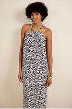 Vestido em malha jersey de poliamida ibodegradável, sustentável e com proteção uv 50+ estampa cones, modelagem levemente ampla, porta seio com elástico, decote trapézio com detalhe pregas e aviamento especial, alça com amarração posterior e comprimento midi. modelo veste tamanho p.