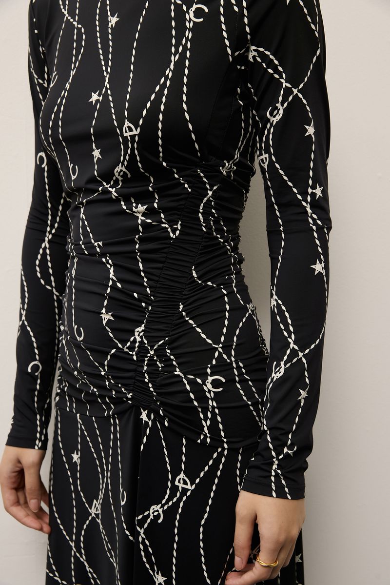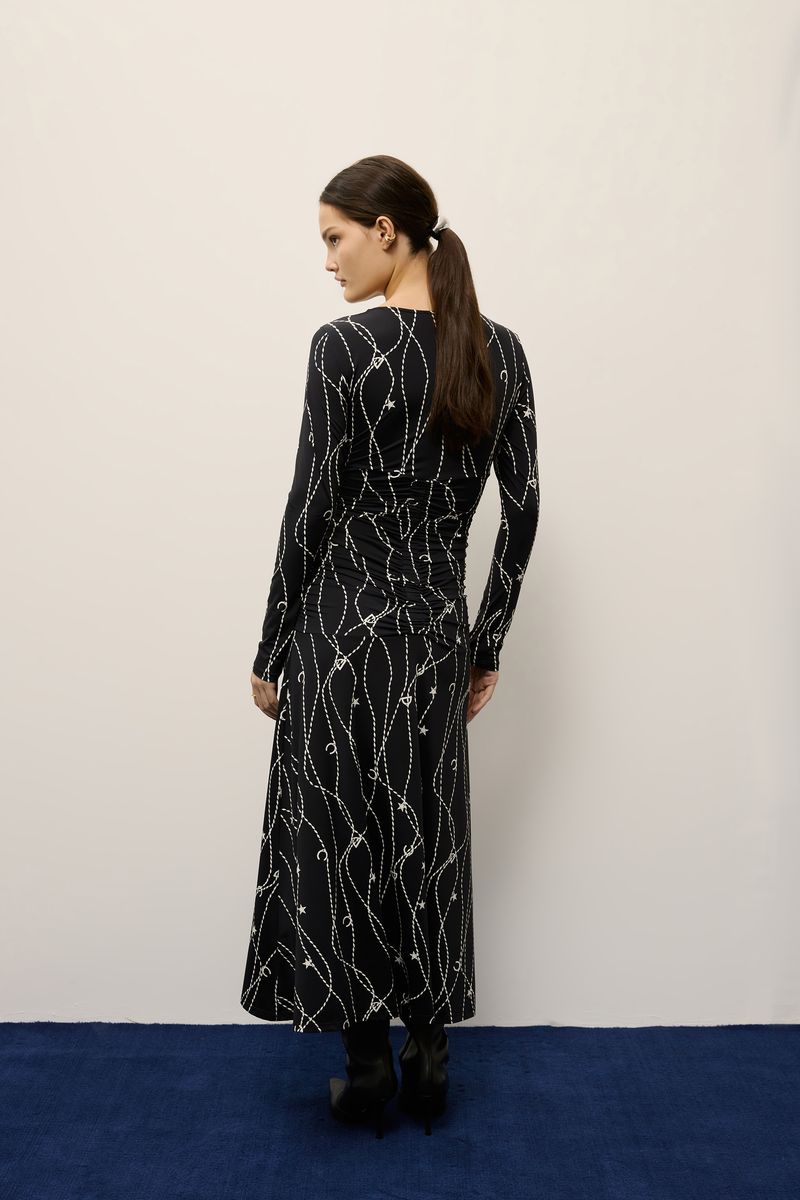 Vestido em malha jersey de poliamida biodegradável, sustentável e com proteção uv 50+ estampa selaria, modelagem ajustada ao corpo com saia evasê, decote redondo, manga longa, detalhe drapeado frente e costas e comprimento midi. modelo veste tamanho p.