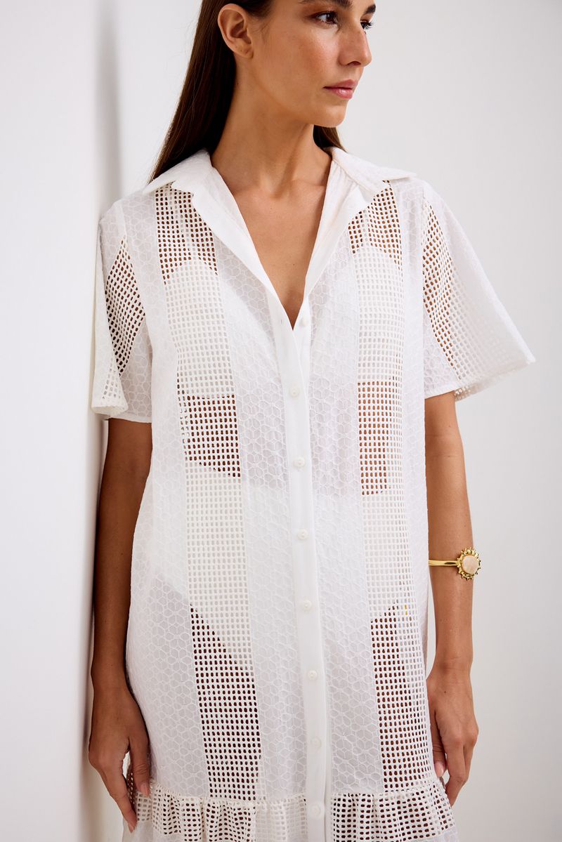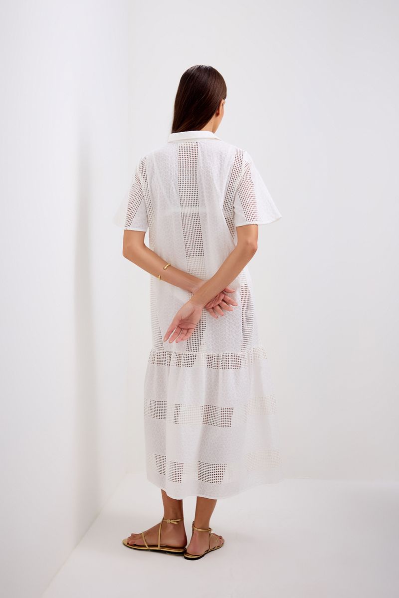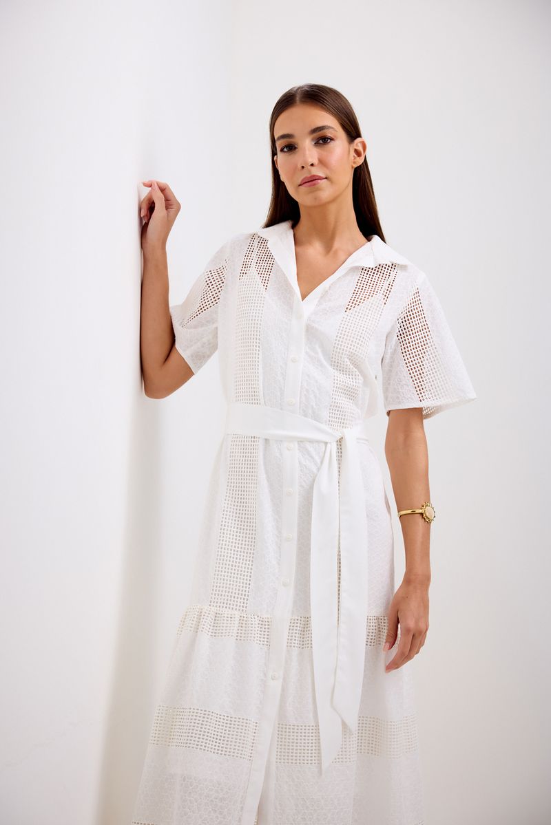 Vestido de tecido plano em laise 100% algodão, estilo chemise com manga curta, comprimento midi e fechamento frontal por botões. peça acompanha combinação e faixa do próprio tecido. modelo veste tamanho 38.
