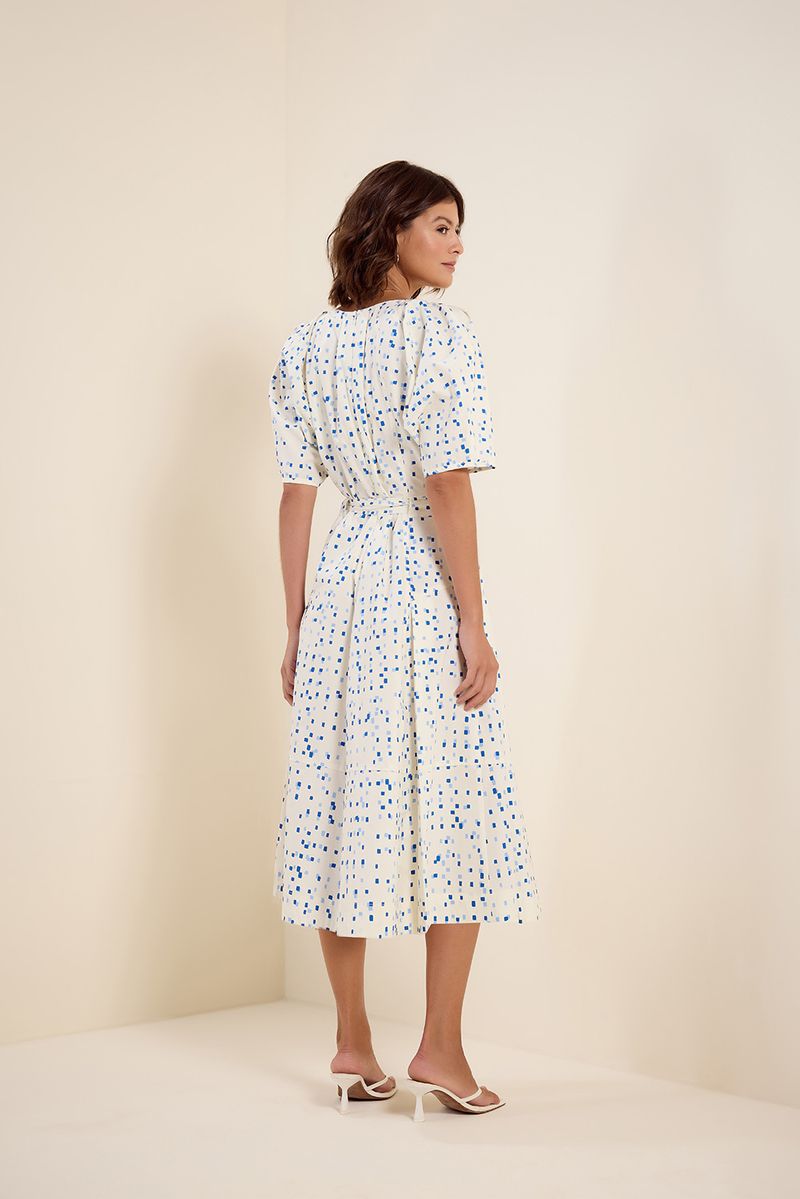 Vestido de tecido plano em algodão, modelagem ajustada ao corpo com saia evasê com recortes, decote v, manga ampla, cinto com fivela, comprimento midi e fechamento por zíper posterior. modelo veste tamanho 38.