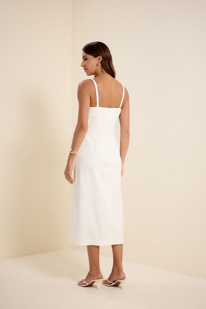 Vestido de tecido plano em algodão, modelagem ajustada ao corpo, comprimento midi com fenda frontal, recortes, decote reto, alça fina e fechamento posterior por zíper invisível. peça possui forro. modelo veste tamanho 38.