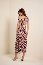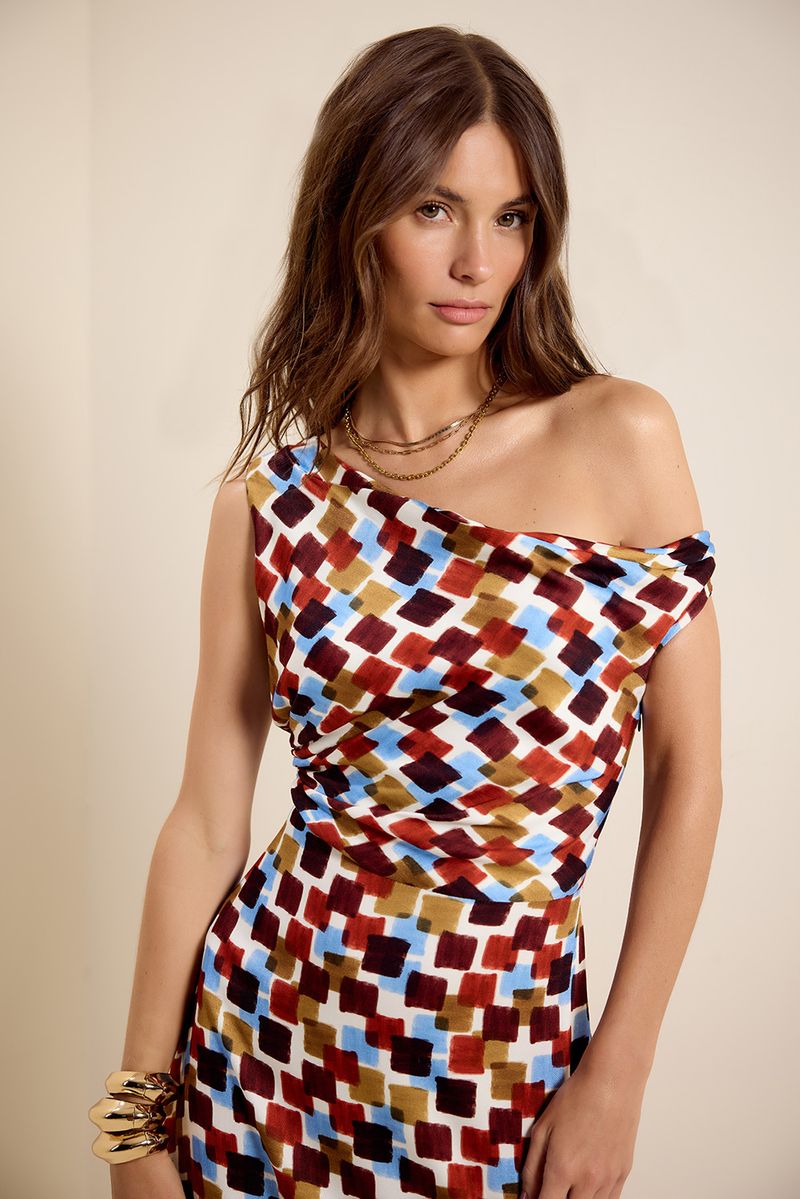 Vestido de tecido plano acetinado em viscose estampa quadros, modelagem ajustada ao corpo com saia em evasê, decote assimétrico com detalhe pregas, manga curta, comprimento midi e fechamento por zíper lateral. modelo veste tamanho 38.