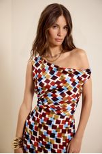 RoupasVestidosVestido decote assimétrico quadros marrom urucum