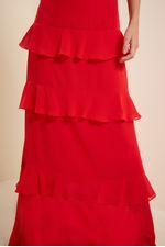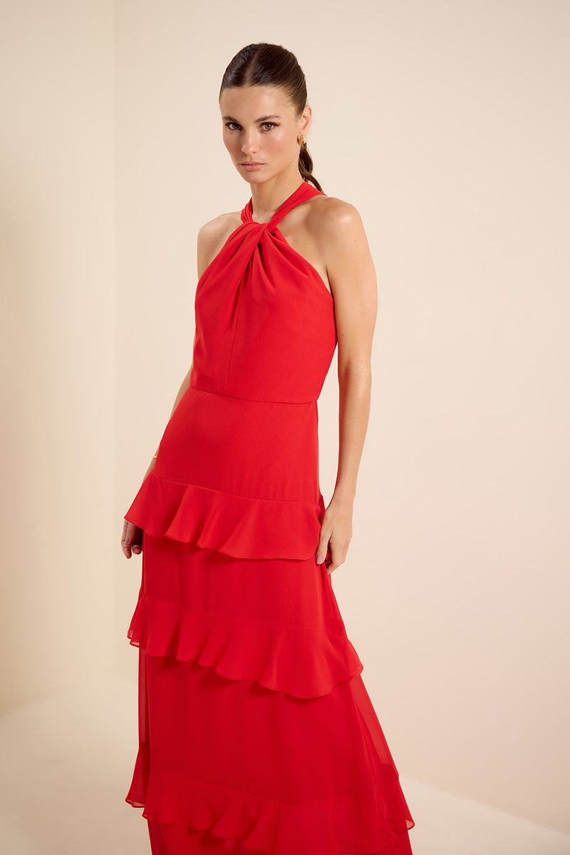 Vestido de tecido plano em crepe ggt leve e fluído, modelagem ajustada ao corpo com saia evasê e detalhe camadas, decote trapézio com pregas e fechamento em botão posterior, sem manga, comprimento longo e fechamento em zíper posterior. peça forrada. modelo veste tamanho 38. peça não acompanha flor, é vendida separadamente.