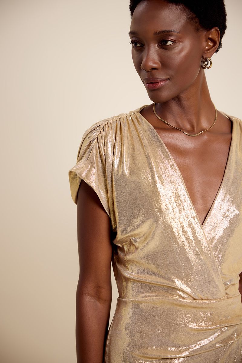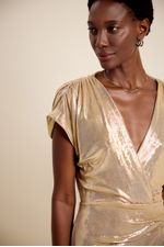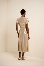 Vestido de malha jersey com foil dourado, modelagem acinturada com saia evasê, decote v transpassado, manga ampla, detalhe torção frontal e comprimento midi. peça forrada. modelo veste tamanho 38.