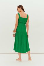 Vestido de tecido plano em viscose com jogo de listras, comprimento midi, decote reto e bolso frontal com lapela. peça possui faixa do próprio tecido. modelo veste tamanho 38.