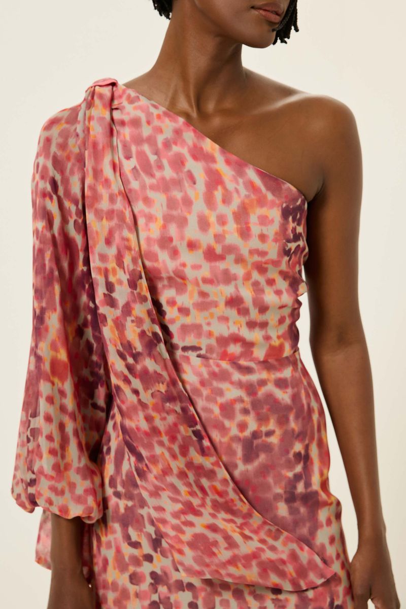 Vestido de tecido plano em ggt de viscose leve e fluido estampa flash, modelo acinturado, saia reta, decote ombro só, manga longa, detalhe capa com amarração lenço ombro, peça forrada e fechamento em zíper lateral. modelo veste tamanho 38.