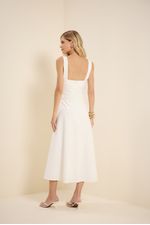 Vestido de tecido plano em algodão com linho, jacquard, com comprimento midi, sem manga, decote reto com recorte no busto e fechamento posterior por zíper invisível. peça possui cinto de elástico com fivela de resina. modelo veste tamanho 38.