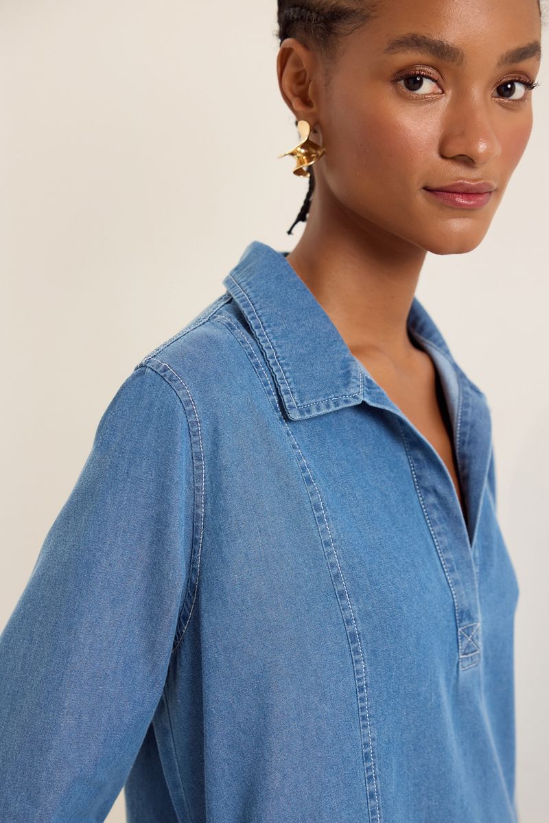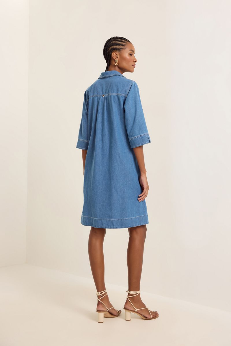 Vestido jeans em tecido de algodão, comprimento curto, saia com leve evasê, manga curta com detalhe de metal no punho, bolso lateral e decote v com gola. peça possui pesponto contrastante. modelo veste tamanho 38.