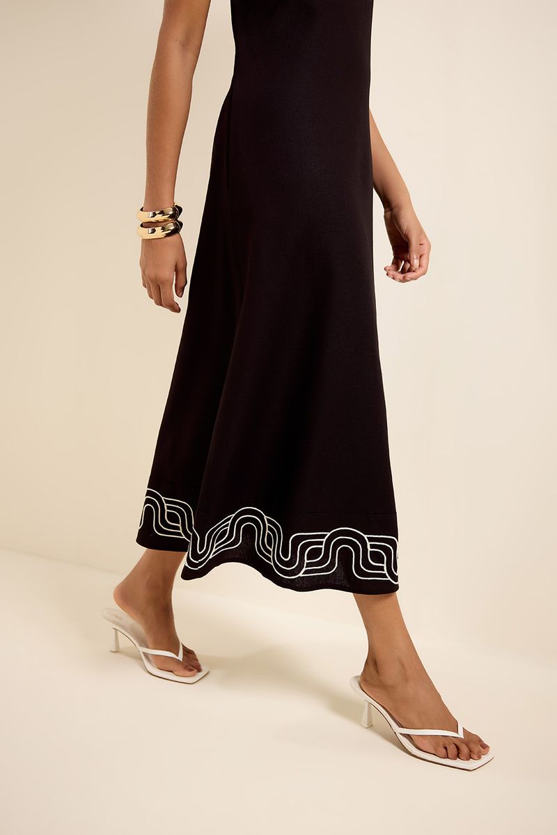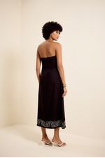 Vestido de tecido plano em viscose com linho, comprimento midi, sem alça com estrutura no busto, bolso lateral, barra com bordado em cordão inspirado no calçadão de burle marx e fechamento posterior por zíper invisível. modelo veste tamanho 38.