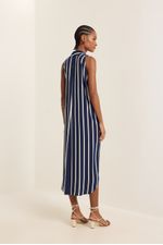 Vestido de tecido plano em viscose listrado, comprimento midi, sem manga, decote v com detalhe dobra e abotoamento frontal. peça possui faixa do próprio tecido. modelo veste tamanho 38.