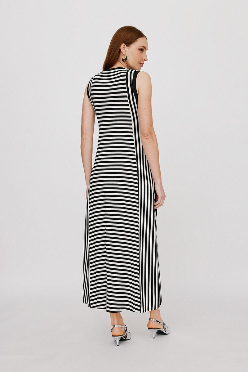 Vestido com mix de malha de viscose listrada preta e branca, detalhe e retilínea no decote redondo e cavas, recortes, fenda frontal e comprimento cropped. modelo veste tamanho p.