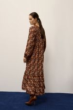 Vestido de tecido plano em viscose com detalhe de lurex estampa floral tropicália, modelagem ampla, decote v com detalhe babado, manga raglan 7/8 com punho elástico, rolotê solto para amarração e comprimento midi. peça acompanha combinação. modelo veste tamanho 38.