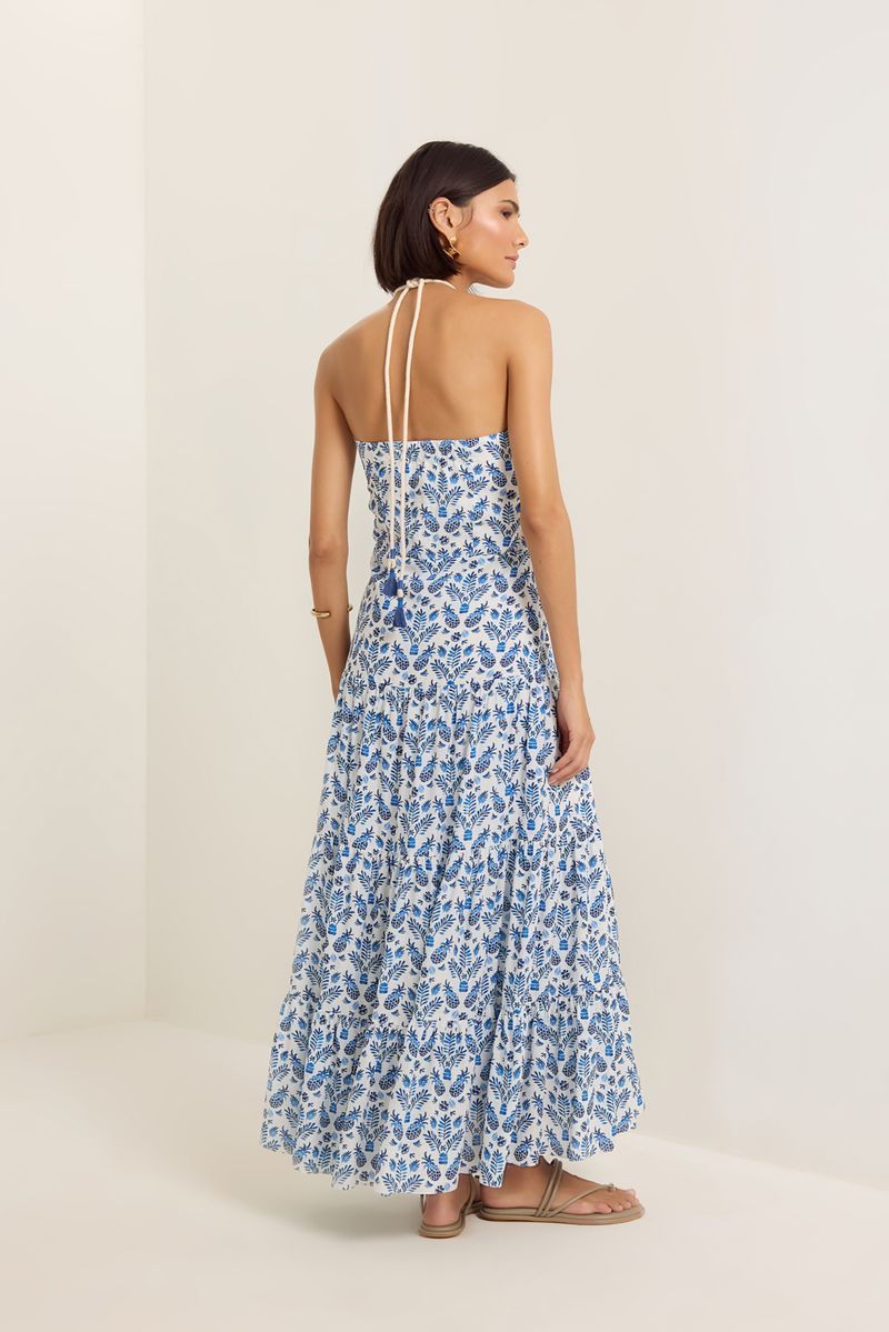 Vestido de tecido plano em voil de algodão com viscose estampa férias, sem manga, decote reto e amarração pescoço com ponteiras personalizada, saia com marias, comprimento longuete e fechamento em zíper lateral. modelo veste tamanho 38.
