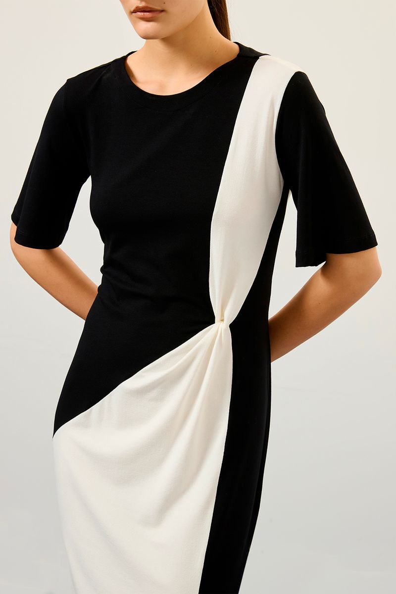 Vestido malha crepe bicolor preto com off white