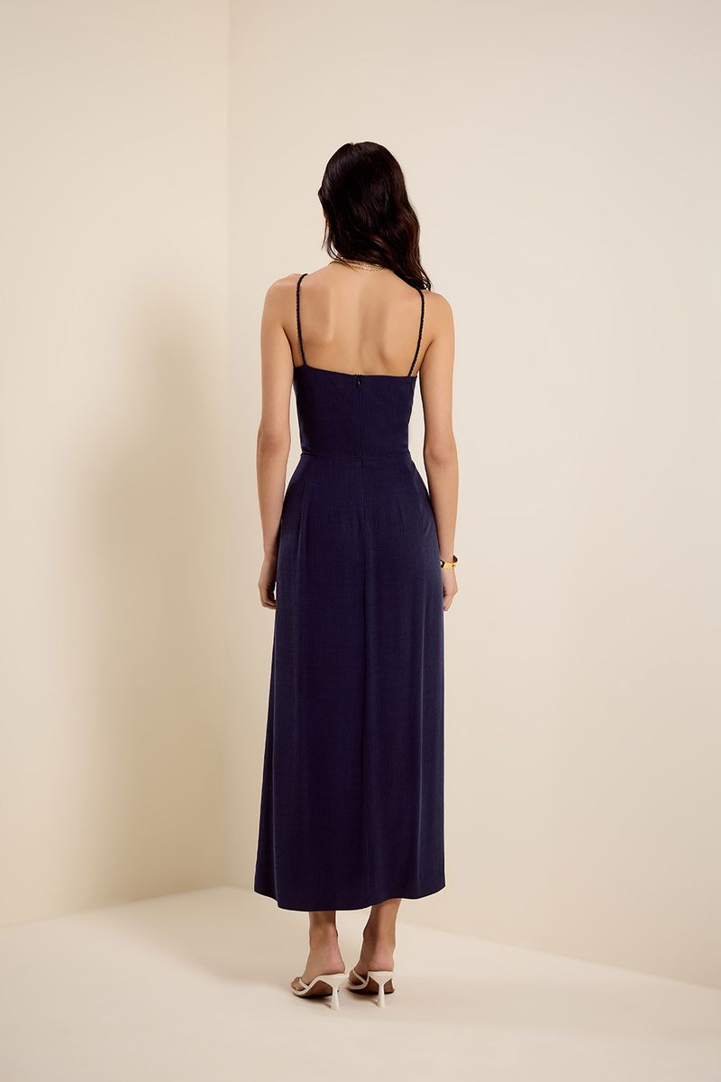 Vestido de tecido plano em liocel com viscose, comprimento midi, sem manga com alças finas, decote v com torção frontal e fechamento posterior por zíper invisível. peça possui forro. modelo veste tamanho 38.