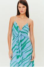 Vestido de tecido plano em ggt de viscose leve, fluído estampa listrado mar, decote v com detalhe de nó frontal ajustável, sem manga, alça fina com regulador, comprimento midi e fechamento por zíper lateral. peça forrada. modelo veste tamanho 38.