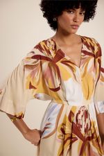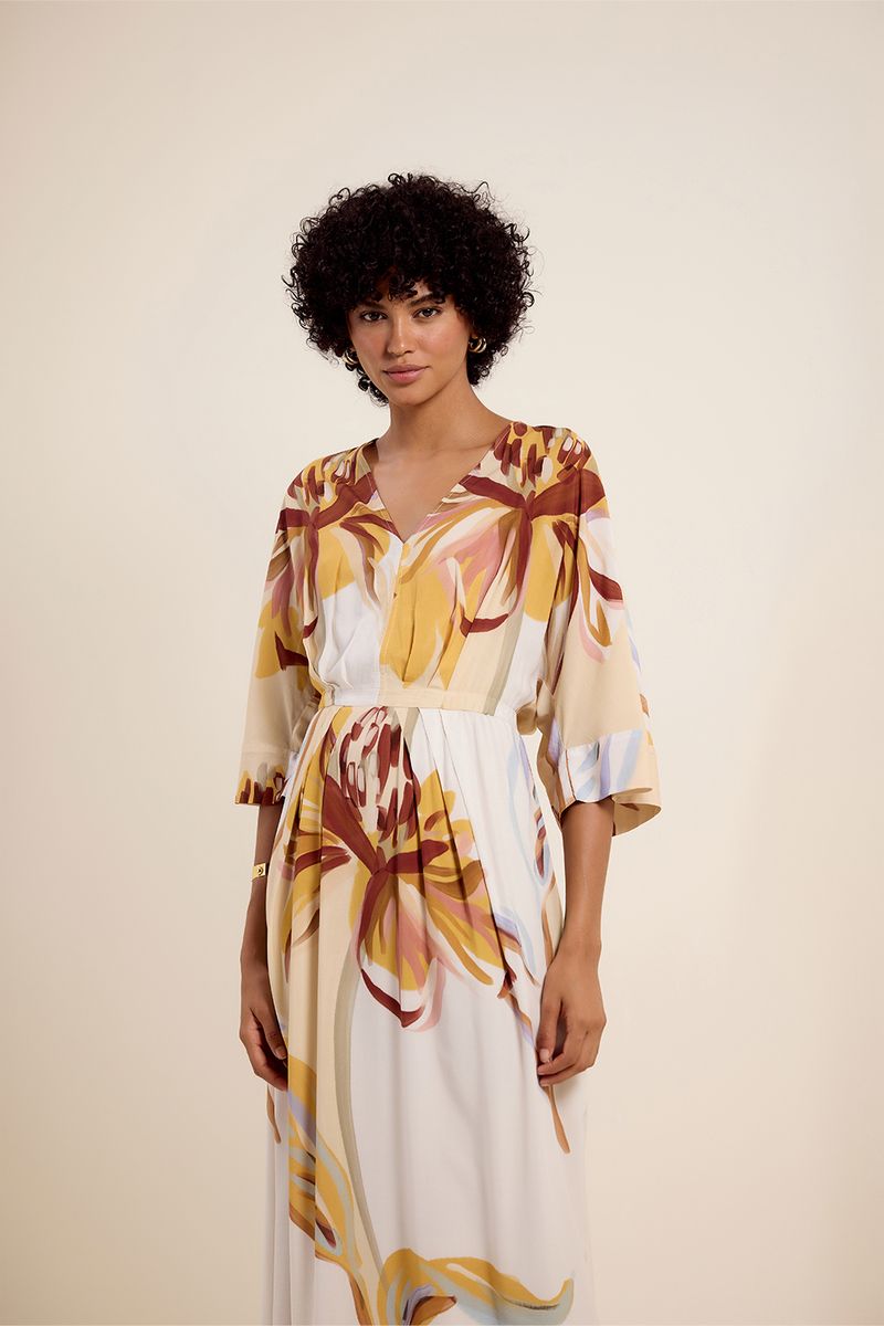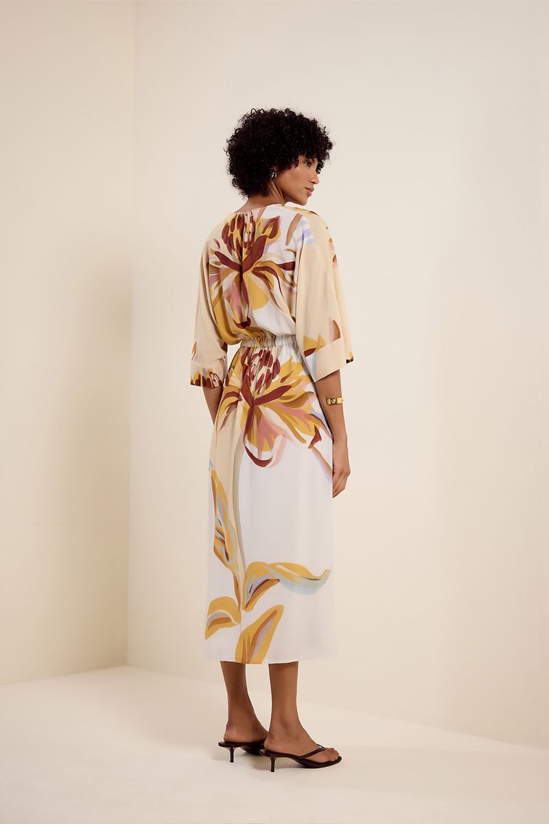 Vestido de tecido plano em viscose leve e fluida estampa floral maxi, modelagem levemente ampla e saia evasê com detalhes pregas e cós posterior com elástico forrado, decote v, manga curta com barra larga e comprimento midi. peça acompanha combinação. modelo veste tamanho 38.