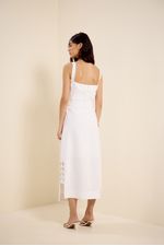 Vestido de tecido plano em rami e algodão, modelagem reta com detalhe lateral em formato triângulo e fenda, decote reto, sem manga e fechamento posterior por zíper invisível. peça possui forro e faixa do próprio tecido. modelo veste tamanho 38.