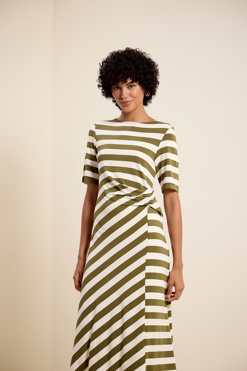 Vestido em malha leve de viscose listrado fio tinto bicolor, modelagem levemente ajustada ao corpo com detalhe torção lateral, decote redondo, manga curta e comprimento midi. modelo veste tamanho p.
